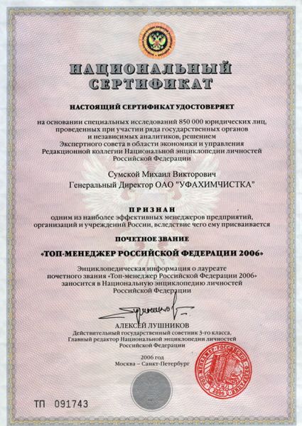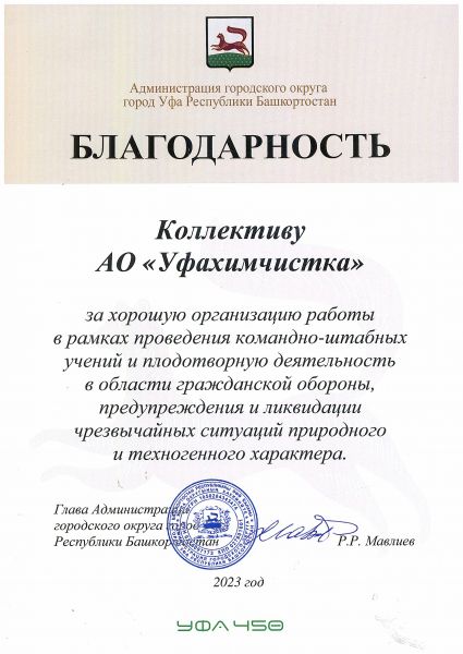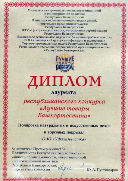 АО «Уфахимчистка» - неоднократный лауреат республиканских, российских и международных конкурсов, обладатель международной награды "За технологию и безупречное качество", г. Париж, 2005 г. за постоянное совершенствование уровня качества, удовлетворение потребности клиентов, за новаторский стиль работы и за достижение превосходного имиджа торговой марки ОАО «Уфахимчистка».